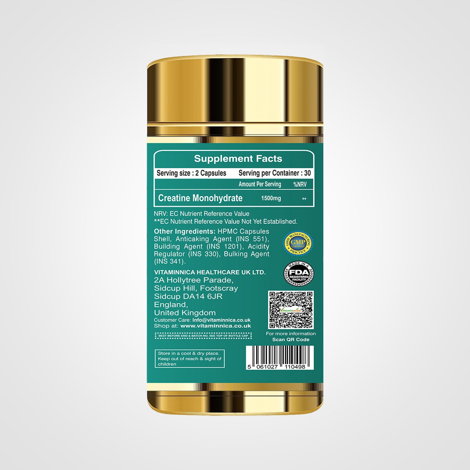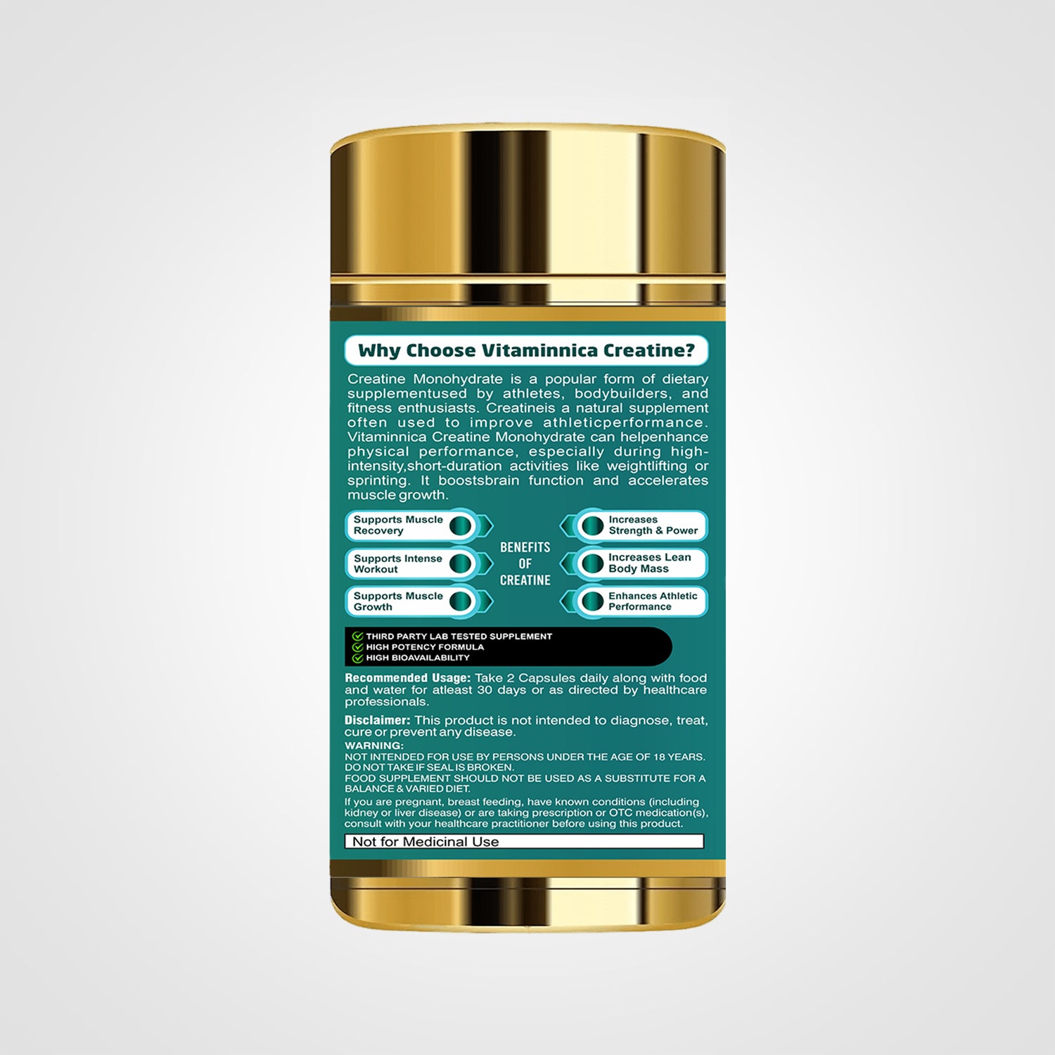 Creatine Monohydrate is a popular form of dietary supplement used by athletes, bodybuilders, and fitness enthusiasts. Creatine is a natural supplement often used to improve athletic performance. Vitaminnica Creatine Monohydrate can help enhance physical performance, especially during high-intensity, short-duration activities like weightlifting or sprinting. It boosts brain function and accelerates muscle growth. Our capsules can increase both short- and long-term muscle mass growth.