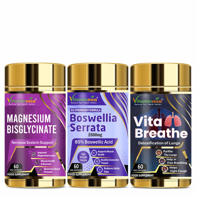 Vitaminnica Magnesium Bisglycinate+ Boswellia Serrata+ Vita Breathe- Combo Pack| 180 Capsules