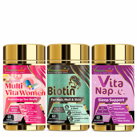 £53.00 GBP£59.00Unit price /UnavailableWomen's Health Bundle- Vitaminnica Multi Vita Women+ Biotin+ Vita Nap Sleep Support- 180 Capsules