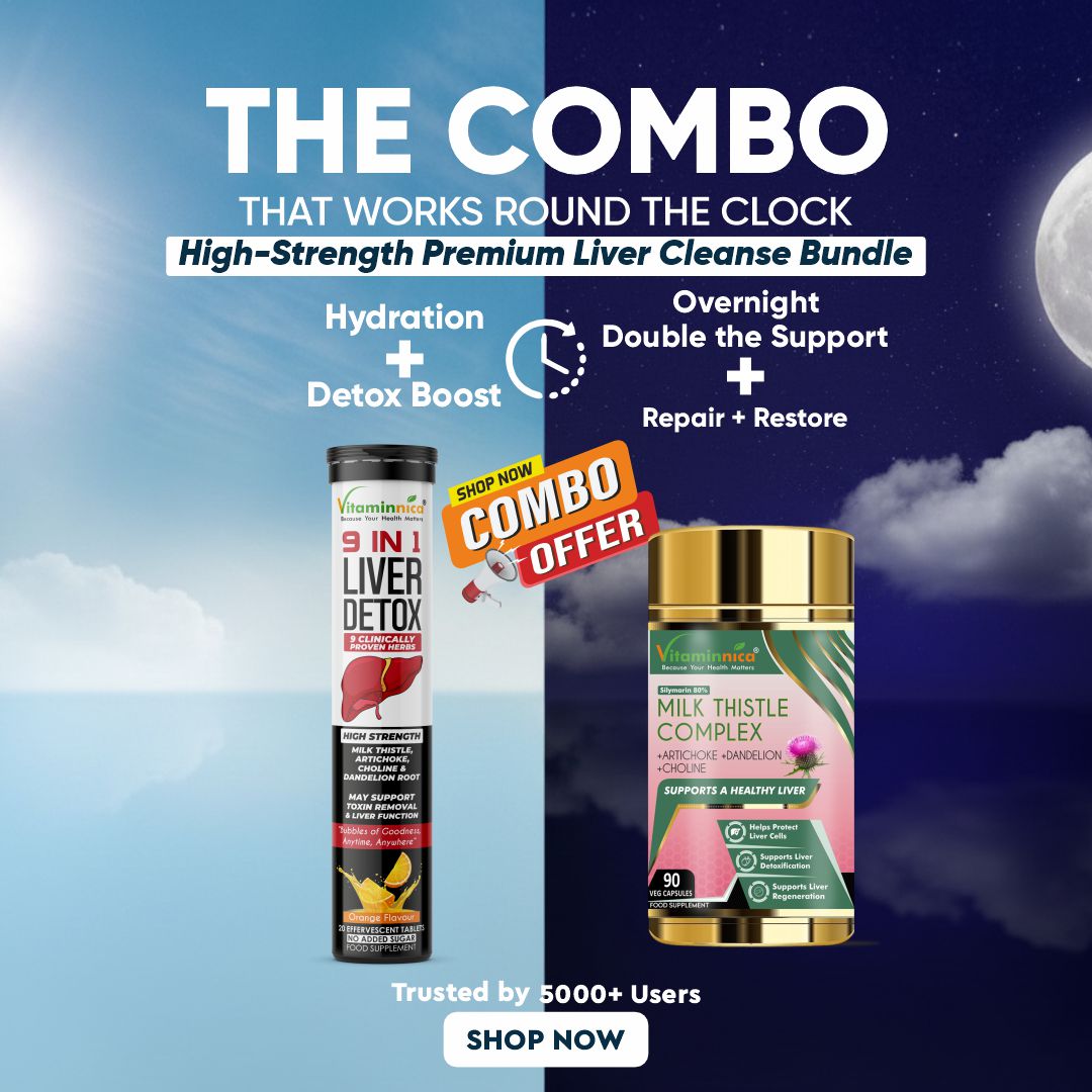 The Vitaminnica Liver Care Combo is a complete daily liver wellness solution, combining the fast-acting benefits of 9in1 Liver Detox Effervescent Tablets with the advanced herbal support of Milk Thistle Complex Capsules.