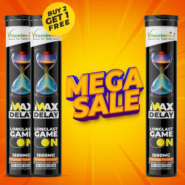 Vitaminnica Max Delay Effervescent Tablets Orange Flavour – Buy 2 Get 1 Free | Stamina, Endurance, Vitality & Sexual Wellness Support | Vegan, Sugar Free