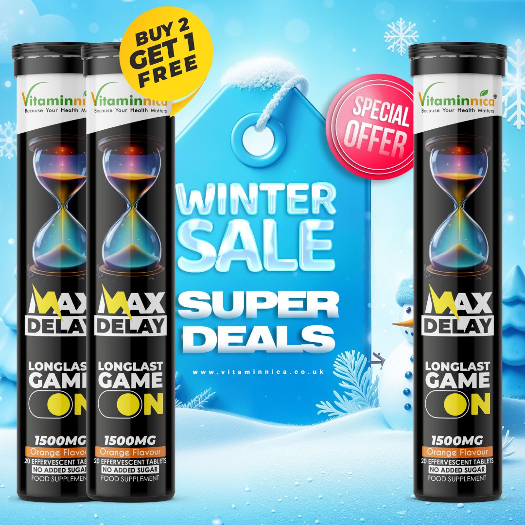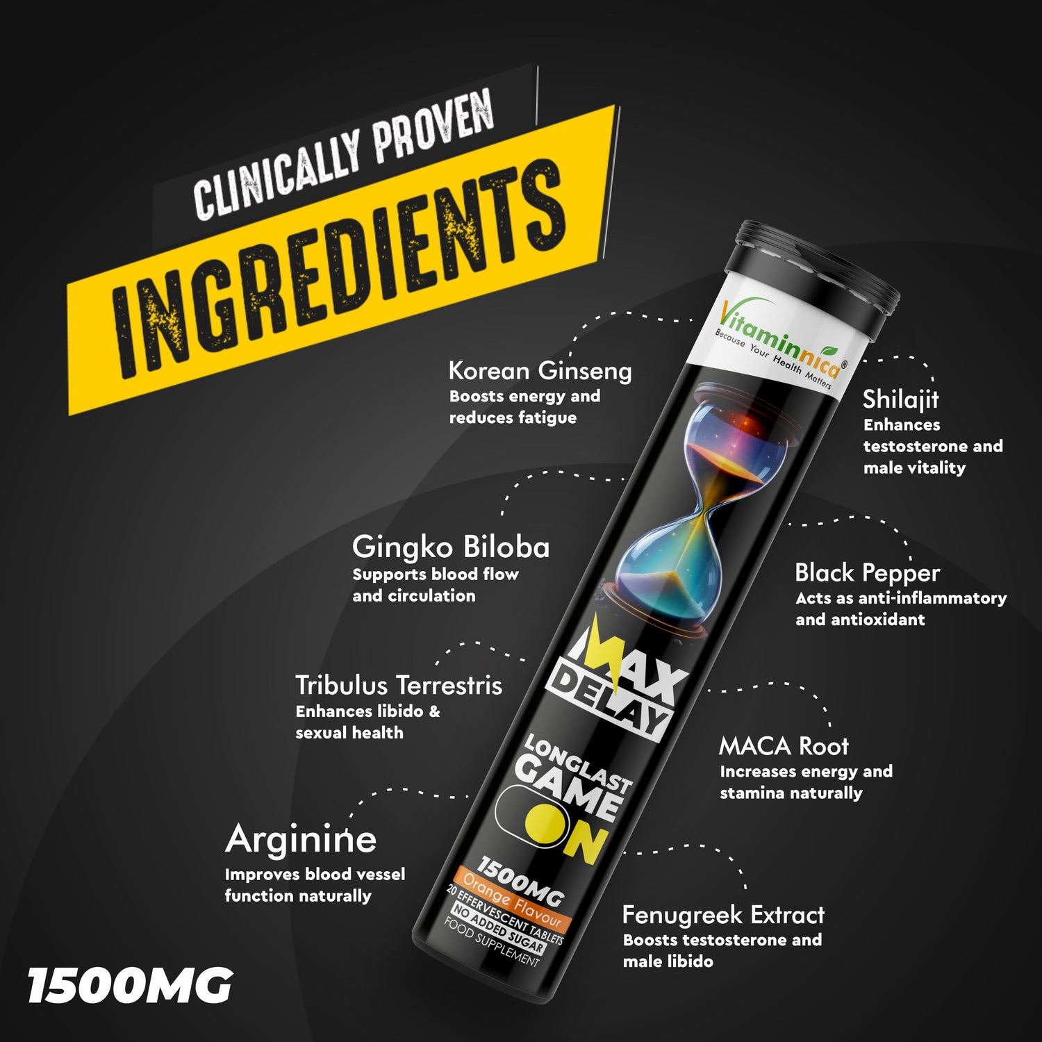 Vitaminnica Max Delay Effervescent Tablets Orange Flavour – Buy 2 Get 1 Free | Stamina, Endurance, Vitality & Sexual Wellness Support | Vegan, Sugar Free